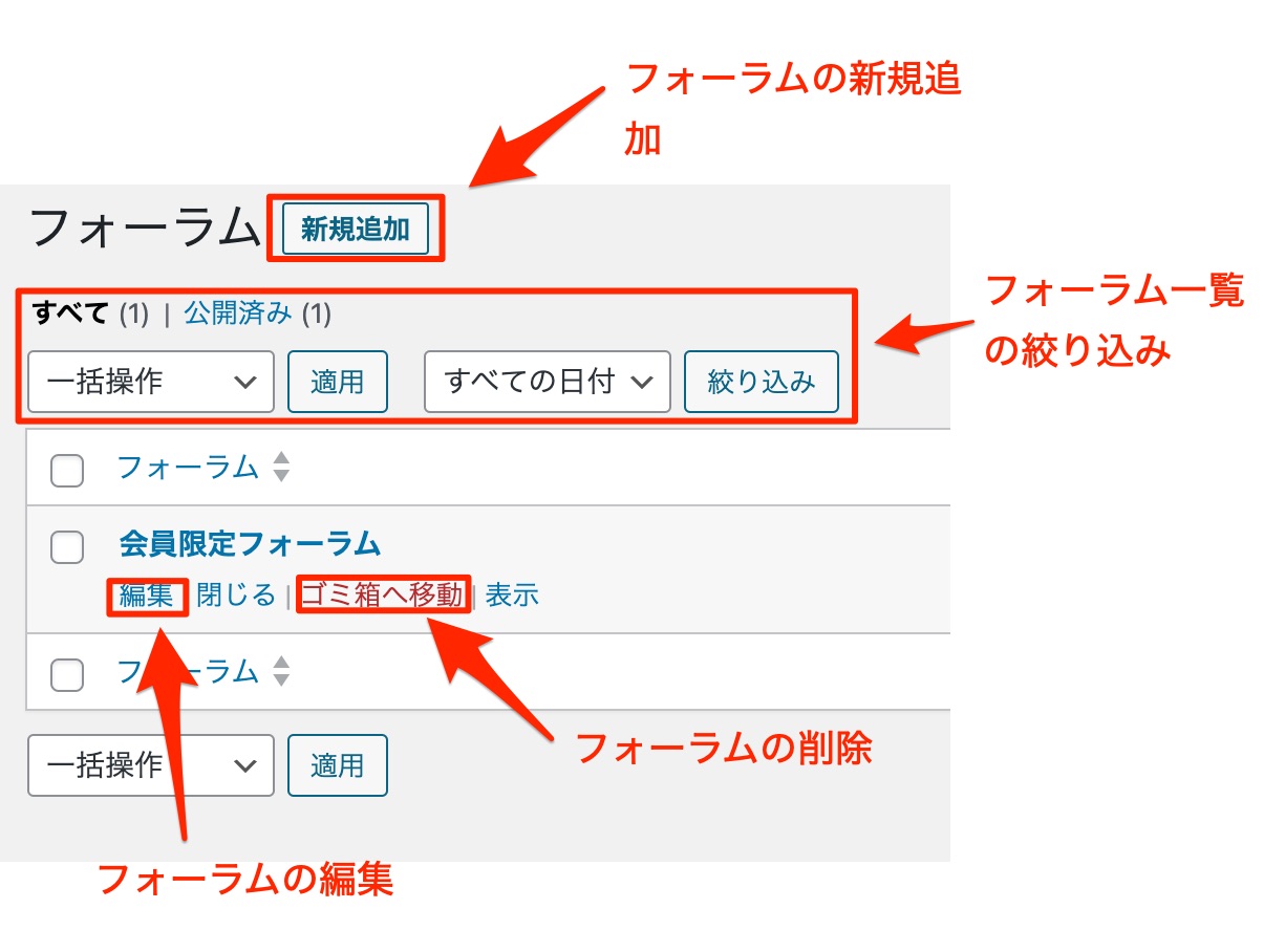 フォーラム一覧から削除したいフォーラムのタイトル下の【ゴミ箱ー移動】をクリックしてフォーラムを削除することができます。
